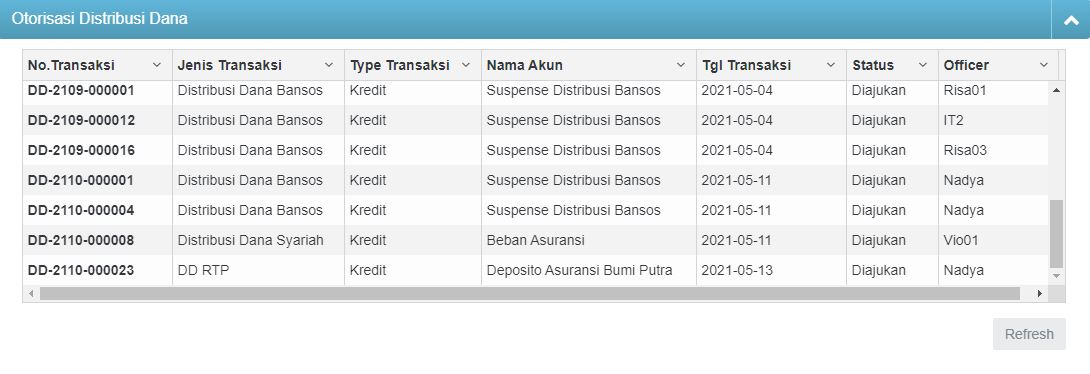 - Pilih Nomor Transaksi di tabel, tampil Detail Otorisasi Distribusi Dana