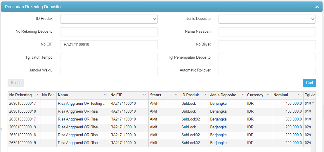 Menampilkan data CIF dan rekening yang ada pada CIF tersebut
