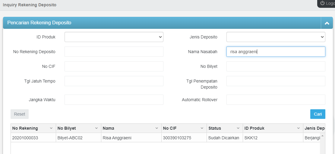 - Isi parameter di form Pencarian Data Rekening Deposito, minimal 1 field terisi